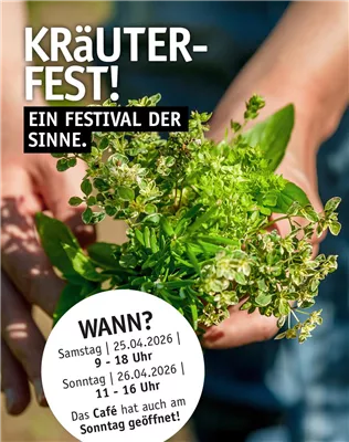 Unser KRäUTERFEST findet am Samstag, den 25.04.2026 von 9 - 18 Uhr und am Sonntag, den 26.04.2026 von 11 - 16 Uhr statt